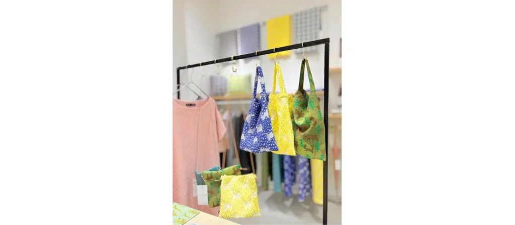 服、ブランケット、クッションカバー、ポーチ、バッグなど時期によっては傘やネクタイも並びます。